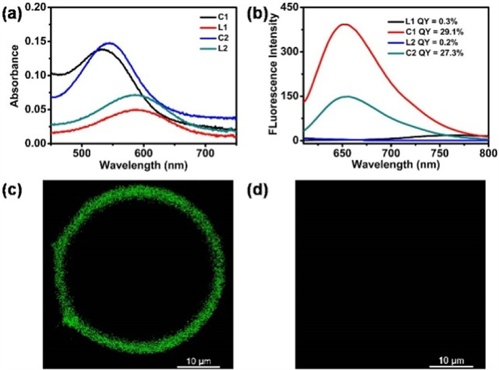 Figure 2.  UV–vis absorption spectra (a) and fluorescence spectra (b) of C1, C2, L1, and L2 in DMSO solution with quantum yield (QY) under conditions of concentration (c) = 10−6 mol/L, λex = 590 nm. Fluorescence image from mixed solution of GUVs and C1 (c), blank group without C1 (d).
