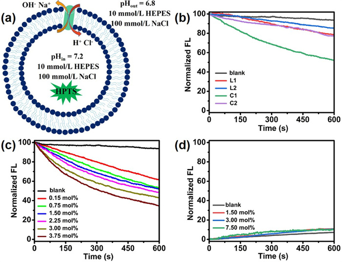 Figure 3  (a) Schematic representation of the ion transport experiment using LUVs loaded with the pH-sensitive fluorophore HPTS and exposed to a pH gradient (internal pH 7.2; external pH 6.8). (b) Ion transportation activities of C1, C2, L1, and L2 at a concentration of 1.50 mol%. (c) Cl transportation activity of C1 at varying concentrations. (d) Normalized calcein fluorescence traces over time in the presence of different concentrations of C1. FL, fluorescence intensity.