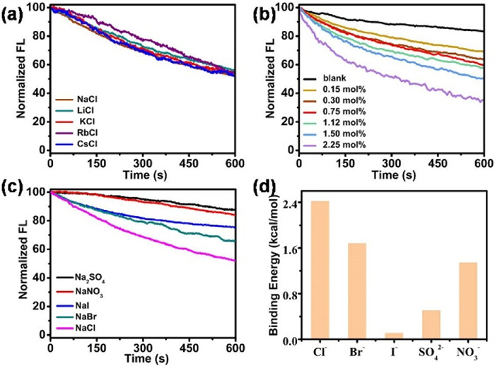 Figure 4  (a) Normalized fluorescence changes of HPTS associated with the transport of alkali metal cations (10 mmol/L HEPES, 100 mmol/L NaCl, M = Li+, Na+, K+, Rb+, and Cs+) by C1 (1.50 mol%) in LUVs suspension as a function of time. (b) Normalized emission intensity of the chloride-sensitive lucigenin dye (λex = 455 nm, λem = 506 nm) at various concentrations of C1. (c) Normalized fluorescence changes of HPTS associated with the transport of anions (10 mmol/L HEPES, 100 mmol/L NaX, X = Cl, Br, I, NO3, or SO42−) by C1 (1.50 mol%) in LUVs suspension as a function of time. (d) Sequence of binding energies between the anions Cl, Br, I, NO3, SO42−, and C1.