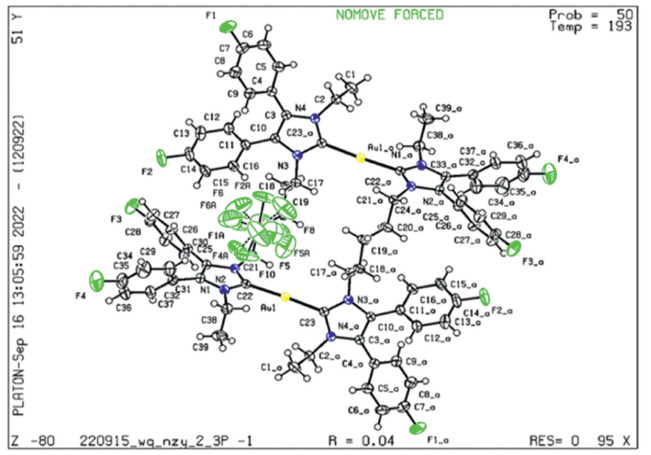 In summary, we reported a series of dinuclear gold(I) NHC complexes with potential antitumor activity against liver cancer cells. The complexes were characterized via NMR and MS, and HPLC for purity. The novel cationic dinuclear gold(I) complex 4a (BF5-Au) with bis-NHC ligands was the most active complex with a linear geometry, indicated through XRC. This series of complexes showed promising inhibitory activity and BF5-Au was selected for further investigation based on its superior antitumor activity. Although BF5-Au showed no inhibitory ability toward TrxR, it exhibited good antitumor activity by preferentially accumulating in mitochondria and boosting the cellular ROS level.