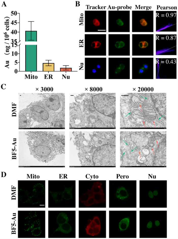 Figure 2.  Cellular distribution of BF5-Au and the generation of H2O2. (A) Gold ions content of organelles in HepG2 after treatment with 4 µmol/L BF5-Au for 24 h. (B) Colocalization of the gold probe and organelle tracker in HepG2 after 4-µmol/L BF5-Au treatment for 3 h. Scale bar: 500 nm. (C) Morphology of HepG2 after 4 µmol/L BF5-Au treatment for 24 h. Scale bar: 500 nm. (D) Change in H2O2 observed by laser confocal microscopy after 4-µmol/L BF5-Au treatment for 3 h. Scale bar: 10 µm. Data are presented as mean ± standard deviation (SD) (n = 3).