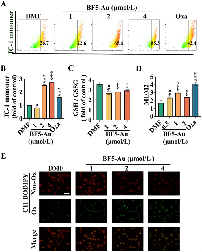Figure 4  BF5-Au damaged mitochondria and induced ferroptosis. (A) MMP detected through fluorescence microscopy and flow cytometry after treatment with BF5-Au (1, 2, and 4 µmol/L) and 10 µmol/L Oxa for 12 h. (B) Quantitative chart of (A). (C) Proportion of GSH/GSSG measured after treatment with BF5-Au (1, 2, and 4 µmol/L) for 12 h. (D) Types of macrophages distinguished by flow cytometry after being cocultured with Hepa 1–6 treated with BF5-Au (0.5, 1, and 2 µmol/L). (E) Lipid peroxide via fluorescence microscopy after treatment with BF5-Au (1, 2, and 4 µmol/L) for 12 h. Data are presented as mean ± SD (n = 3). P < 0.05, **P < 0.01, ***P < 0.001. Scale bar: 100 µm.