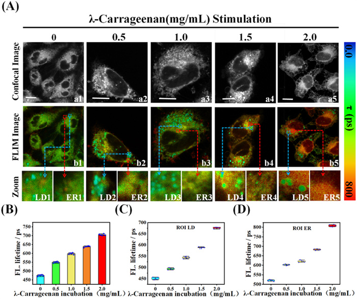 Figure 2  (A) FLIM image of WY-V in HepG2 cells stimulated with different concentrations of λ-carrageenan (0, 0.5, 1.0, 1.5, 2.0 mg/mL). (a1–a5) Bright field diagrams; (b1–b5) FLIM image of WY-V in HepG2 cells; (LD1–LD5) Partial view of LD; (ER1–ER5) Partial view of ER. (B) Mean fluorescence lifetime plotted against λ-carrageenan concentration. (C) Plot of LD average fluorescence lifetime as a function of λ-carrageenan concentration. (D) Plot of ER average fluorescence lifetime as a function of λ-carrageenan concentration. Scale bar: 10 µm.