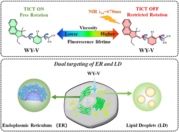 Scheme 1.  (A) Chemical structure and fluorescence lifetime response mechanism of WY-V. (B) Schematic of intracellular targeting of ER and LD of WY-V.