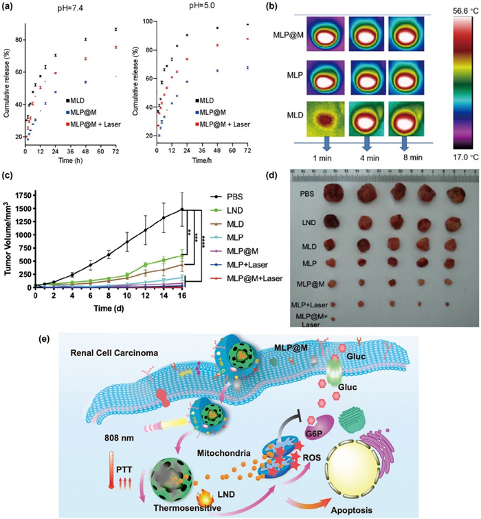 Figure 4 (a) In vitro drug release profiles at pH 7.4 and pH 5.0 (mean ± SD, n = 3). (b) NIR thermal images of MLD, MLP, and MLP@M under an 808 nm laser irradiation for different time. (c) Tumor growth variations of mice, mean ± SD (n = 5), **P < 0.01, ***P < 0.001, ****P < 0.0001. (d) Representative images of dissected tumors of each group on the 17th day. (e) Mechanism of MLP@M. Reproduced with permission [43]. Copyright 2021, Elsevier Inc.