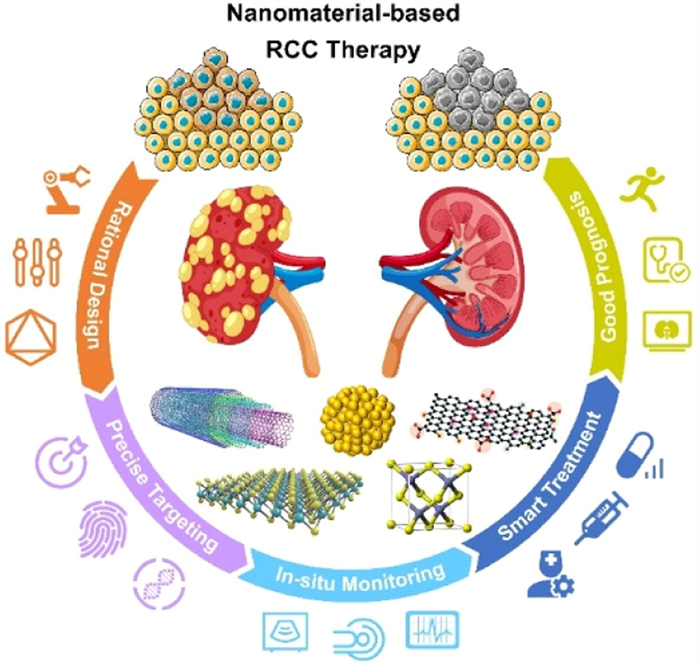 To begin with, a comprehensive acknowledgment of the pathogenesis, progression, diagnosis, treatment, and prognosis of RCC is required. An in-depth understanding of RCC is the basis for identifying the therapeutic targets. Fenton reaction in the tumor microenvironment is the most common therapeutic target in nanomaterial-based cancer therapy so far [63–65]. The weak acidity and overexpression of hydrogen peroxide in the tumor cells would be exploited by the nanomaterials to generate reactive oxygen species for tumor control. The relevant research is rooted in the understanding of physiological regulation by oxygen-related enzymes, as well as the extensive study on Fenton reaction in environmental catalysis. As increasing physiological processes are dissected at the atomic/molecular level, growing attention has linked nanomaterial-based cancer therapy to other therapeutic targets, such as autophagy, ferroptosis, glucose metabolism, DNA damage, and so on. The relevant in-depth analysis helps to comprehensively analyze the function of nanomaterials (usually not a single one), and guide the screening and design of nanomaterials.