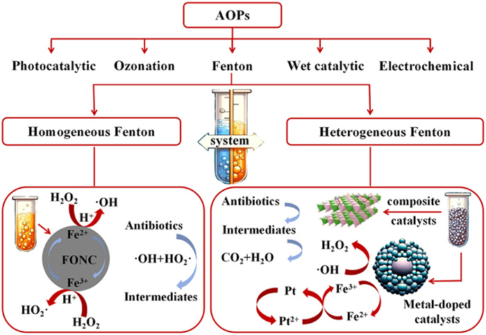 The Fenton process effectively treats antibiotic-contaminated wastewater, as highlighted in Table 1 [54,77–81], with studies showcasing its capacity to degrade antibiotics and reduce pollution. Recent advances focus on doping reactive metals and integrating diverse materials to enhance its efficacy.