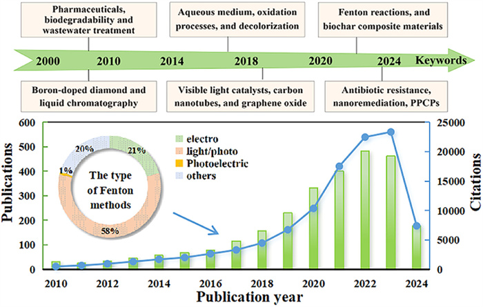 In the past 15 years, publications and citations on Fenton-like methods for treating antibiotic-contaminated wastewater have steadily increased, with a notable surge from 2016 to 2022 (Fig. 2), reflecting growing academic interest in this field. Concurrently, an analysis of keywords from related articles published between 2000 and 2024 in the Web of Science Core Collection, conducted using the Citespace tool with γ [0,1] = 0.7, is also depicted in Fig. 2 [20,21]. Initially focused on biodegradability, research gradually shifted towards catalytic materials like boron-doped diamond and, later, nanomaterials such as graphene oxide. Research emphasizes antibiotic contamination, nanomaterial-based AOPs, and toxicity assessment of degradation byproducts. Key concerns remain around ARGs and persistent pollutants, including pharmaceuticals and personal care products (PPCPs), which continue to challenge water treatment practices [22].