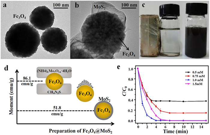 Figure 3 (a) TEM images of Fe3O4, (b) Fe3O4@MoS2–3. (c, d) Demonstration of Fe3O4 and Fe3O4@MoS2–3. (e) Effect of peroxymonosulfate (PMS) dose on the degradation of SA by Fe3O4@MoS2–3. Copied with permission [18]. Copyright 2021, Chemical Engineering Journal.