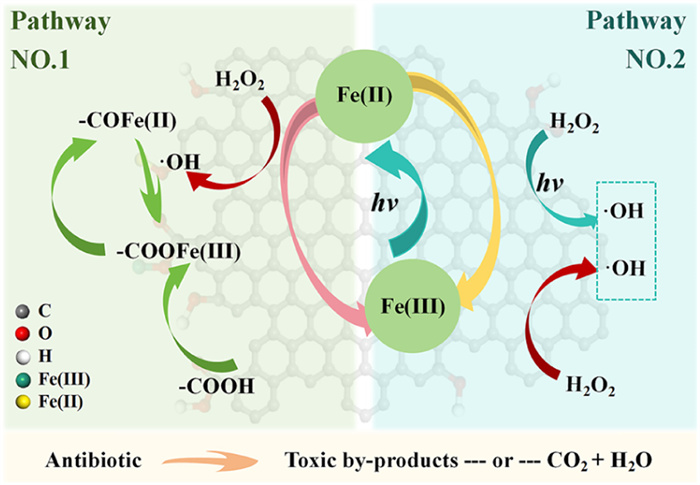This combined catalytic and adsorptive effect aligns with previous research [72,73]. Presently, two main academic theories are proposed to elucidate the mechanism by which carbon materials participate in the Fe(Ⅲ) reduction process. One theory suggests that reducing groups are directly involved in electron transfer, whereas the other proposes that conductive carbon acts as an electron mediator (Fig. 4) [72,74]. Although these theories differ, both aim to improve catalyst cycling efficiency and overall system stability for enhanced pollutant removal. Functionalizing carbon materials and optimizing their structure can facilitate free radical oxidation and the mineralization of organic pollutants even at low concentrations [75,76].