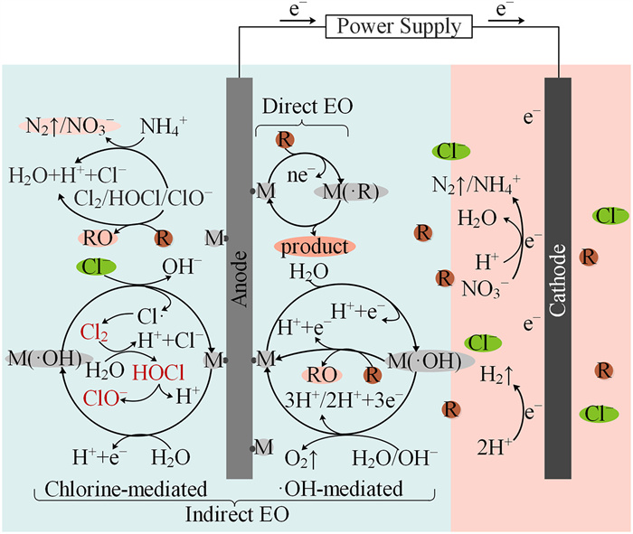 • Figure 1  Schematic illustration for the EO process. R denotes an organic pollutant and M is the active site on the electrode surface.