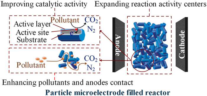 The direct electron transfer process and indirect oxidation by oxidants primarily depend on the anode for the electrochemical reaction. Recently, various anodes such as boron-doped diamond (BDD), lead dioxide (PbO2), ruthenium dioxide (RuO2), tin dioxide (SnO2) and their composite electrode were studied for EO landfill leachate treatment. For example, 83.7% of COD was removed under 100 mA/cm2 with ruthenium iridium oxide electrode (Ti/RuO2-IrO2) [20]. The use of graphite/PbO2 electrode could remove 35.1% COD and 97.6% NH4+ from leachate after 2 h of electrolysis [21]. However, studies on electrochemical landfill leachate treatment are still largely limited to the laboratory stage due to technical limitations of the electrodes, including poor electron transfer performance, small specific surface area, single reactor operation mode, and insufficient space utilization.