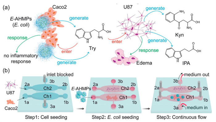 Figure 1.  Illustration of the influence of tryptophan metabolism among cells and the manipulation for GBA simulation on MCM. (a) Three types of changes were noted in three colors: blue for chemical reactions; green for morphological responses of cells; and red for the direction of tryptophan transportation. (b) Seeding protocol: step 1, Caco2 and U87 were seeded in Ch1 and Ch2, respectively; step 2, delivery of E-AHMPs (E. coli) into Ch1 after cells adhesion; step 3, continuous flow by the direction of 3a to 3b while the other four inlets were blocked.
