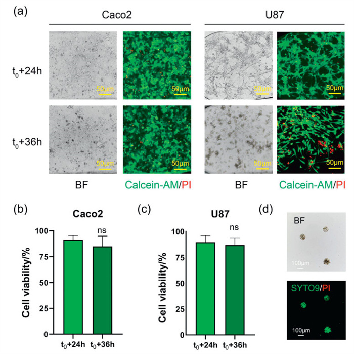 Figure 2  Sustainability of cells and E-AHMPs in MCM. (a) Images of viable/dead cells characterized by Calcien-AM/PI at t0 + 24 h and t0 + 36 h. (b, c) Histograms of cell viability at t0 + 24 h and t0 + 36 h. Significance was calculated by unpaired t-test: P = 0.3629 for Caco2 and P = 0.6541 for U87, both non-significant results. (d) Images of viable E. coli in AHMPs characterized by SYTO9 and no PI signal were captured during the process (E. coli concentration of 1 × 104 CFU/mL).