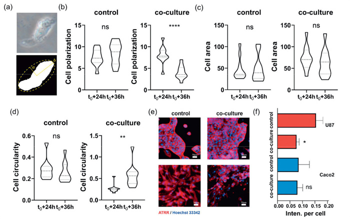 Figure 3.  Parameters describing the morphological alterations of U87 cells before and after the co-culture (control referred to Caco2 + U87, co-culture referred to Caco2 + U87 + E. coli). (a) Graph of U87 cells after being transformed into black and white 2D graphics in ImageJ software, where the yellow border in the right panel indicates the external ellipse of the cell, and a and b are the half-length and half-short axes of the external ellipse, respectively. (b-d) Polarization rate (P = 0.3233, P < 0.0001), cell area (P = 0.9763, P = 0.3328), and roundness (P = 0.5017, P = 0.0018) of U87 cells in the control groups versus the co-culture groups, respectively. (e) Fluorescence views of Caco2 and U87 with or without E-AHMPs. Nucleus stained with DAPI and F-actin labeled with ATTR. (f) Quantification of average F-actin level of Caco2/U87 cells. Significance was calculated by a two-way t-test (P = 0.0103 for U87 and P = 0.5041 for Caco2).