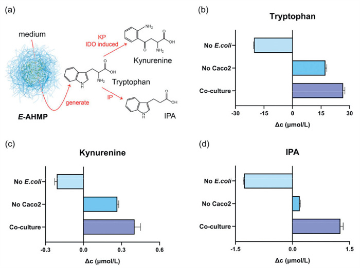 Figure 4.  Tryptophan metabolism results analyzed by LC-MS. (a) Two metabolic pathways of excess tryptophan produced by E. coli in AHMPs. (b) ∆c(Trp) values from left to right are 26.62, 17.32 and 20.23 µmol/L. (c) ∆c(Kyn) values from left to right are 0.40, 0.27 and 0.21 µmol/L. (d) ∆c(IPA) values from left to right are 1.26, 0.19 and 1.27 µmol/L.