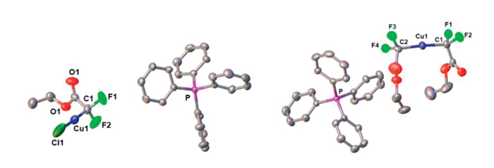 Figure 1  ORTEP drawings of Q+ [Cu(CF2CO2Et)(Cl)]- 1a (left) and Q+ [Cu(CF2CO2Et)2]- 1b (right). Thermal ellipsoids are drawn at 30% probability.