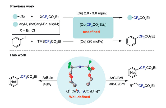 These stoichiometric reactions laid the foundation for the development of the first copper-catalyzed ethoxycarbonyl difluoromethylation of benzylic or allylic halides with TMSCF2CO2Et. Extended research revealed that complex 1b, due to its high reactivity, serves as a powerful ethoxycarbonyl difluoromethylating reagent to allow a broad range of substrates, including electron-deficient and electron-rich aryl iodides, activated heteroaryl chlorides and aryl bromides with a directing group, heteroaryl bromides, alkyl iodides, as well as other electrophiles such as acid chloride, disulfide, diphenyliodonium, to undergo ethoxycarbonyl difluoromethylation in moderate to excellent yields. Moreover, complex 1c effectively participated in oxidative ethoxycarbonyl difluoromethylation with a variety of lithium nbutyl arylboronic acid pinacol esters, alkenyl and heteroarene in the presence of an oxidant. Ongoing studies in our laboratory are delving into the mechanistic aspect of the copper-mediated or -catalyzed fluoroalkylation reactions, with the findings to be reported in due course.