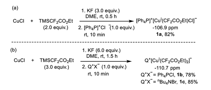 In our quest to isolate the ethoxycarbonyl difluoromethyl-ated Cu(Ⅰ) species, we sought to determine the optimal conditions for the formation of either Q+ [Cu(CF2CO2Et)(Cl)]- 1a (Q = Ph4P) or Q+ [Cu(CF2CO2Et)2]- 1b through the reaction of CuCl with TMSCF2CO2Et in the presence of an activator in various solvents at room temperature. We discovered that the reaction time and the amount of TMSCF2CO2Et/KF is crucial for the smooth generation of both complexes. Stirring a mixture of CuCl with 2.0 equiv. of TMSCF2CO2Et and 3.0 equiv. of KF in DME generated a new signal with a chemical shift of −106.9 ppm in 85% yield after 0.5 h at room temperature (Scheme 2a). With extended reaction times, the peak intensity gradually diminished, and a new peak at −110.7 ppm emerged. By increasing TMSCF2CO2Et to 3.0 equiv. and KF to 6.0 equiv., the species with chemical shift at −110.7 ppm was formed in 80% yield after 1.0 h at room temperature (Scheme 2b), while the other species with chemical shift at −106.9 ppm was obtained in only 5%. Addition of 1.0 equiv. of [Ph4P]+Cl- to the solution, followed by stirring for an additional 5.0–10.0 min and standard workup, yielded 1a in 82% yield and 1b in 78% yield (85% when the cation is nBu4 N). Both complexes were characterized by 1H, 19F and 31P NMR spectroscopies as well as elemental analysis. The structures were validated by single crystal X-ray diffraction (Fig. 1). The solid-state structure of complex 1b (Fig. 1, right) exhibits a linear configuration with the C1-Cu-C2 bond angle of 175.67 (13)°. The two Cu-C bond lengths in complex 1b are 1.937(4) Å and 1.959(4) Å, respectively. These Cu-C bond lengths was longer than known [Ph4P]+ [Cu(CF3)2]- (1.930 Å) [2931] and are close to those in [Ph4P]+ [Cu(CF2H)2]- (1.934 Å, 1.971 Å) [32].