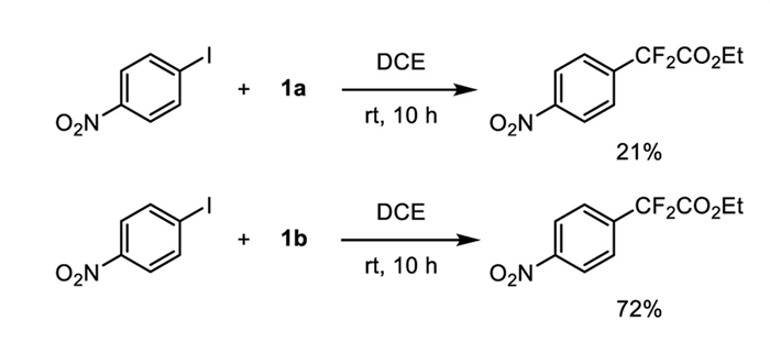 With both complexes 1a and 1b in hand, we proceeded to evaluate their reactivity in the ethoxycarbonyl difluoromethylation of aryl iodides. For this purpose, we selected the reaction with the electron-deficient substrate 1-iodo-4-nitrobenzene as a benchmark to assess their efficacy. When complex 1b (1.0 equiv.) was allowed to react with 1-iodo-4-nitrobenzene in DCE at ambient temperature for 10 h, it yielded the corresponding product ethyl 2,2-difluoro-2-(4-nitrophenyl)acetate with a yield of 72% yield. In contrast, the analogous reaction with complex 1a occurred in 21% yield (Scheme 3). These findings indicate that the reactivity of complex 1b is much higher than that of complex 1a for ethoxycarbonyl difluoromethylation of the aryl iodides.