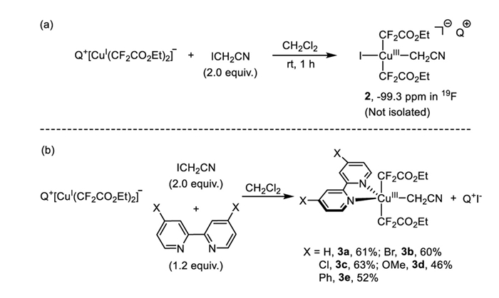 In summary, our curiosity about the active species in copper-mediated ethoxycarbonyl difluoromethylation of organohalides led us to isolate and characterize the first ethoxycarbonyl difluoromethylated Cu(Ⅰ) species Q+ [Cu(CF2CO2Et)(Cl)]- 1a and Q+ [Cu(CF2CO2Et)2]- 1b. Stoichiometric reactions of complexes 1a and 1b with electron poor aryl iodide 1-iodo-4-nitrobenzene showed that complex 1b is much more reactive than complex 1a. In addition, oxidative addition of complex 1b with iodoacetonitrile in the presence of a bidentate nitrogen ligand led to the formation of stable Cu(Ⅲ) complexes [(L)Cu(CF2CO2Et)2(CH2CN)] 3a-e that underwent reductive elimination to give NCCH2CF2CO2Et in high yields.