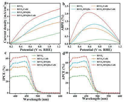Figure 4.  (a) LSV curves, (b) ABPE spectra, (c) IPCE spectra, (d) APCE spectra of BiVO4, BiVO4/BNQDs, BiVO4/CoBi and BiVO4/BNQDs/CoBi photoanodes.