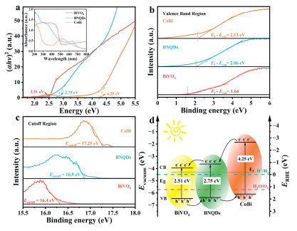 Figure 6.  (a) UV–vis DRS and Tauc plots of BiVO4, BNQDs and CoBi powders. (b, c) UPS plots of BiVO4, BNQDs and CoBi powders. (d) Charge flow paths for BiVO4/BNQDs/CoBi photoanode.