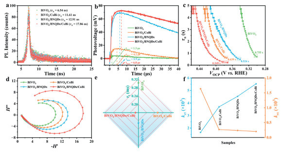 Figure 7.  (a) TRPL spectroscopy, (b) TPV spectroscopy, (c) OCP-derived carrier transfer lifetimes, (d) IMPS spectra, (e) the average charge transport time τt and (f) charge transfer and recombination rate constant of BiVO4, BiVO4/BNQDs, BiVO4/CoBi and BiVO4/BNQDs/CoBi photoanodes.