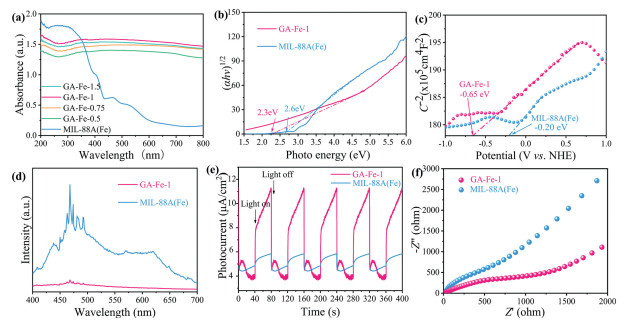 Figure 3.  (a) UV–vis DRS spectra of MIL-88A(Fe) and GA-Fe-X composites. The band gaps (b), the Mott-Schottky plots (c), PL spectra (d), the I-t curve (e) and EIS Nyquist impedance plots (f) of MIL-88A(Fe) and GA-Fe-1.