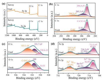 Figure 4.  XPS spectra of GA-Fe-1before and after the cycling tests, the XPS spectra survey (a), C 1s (b), O 1s (c), and Fe 2p (d).