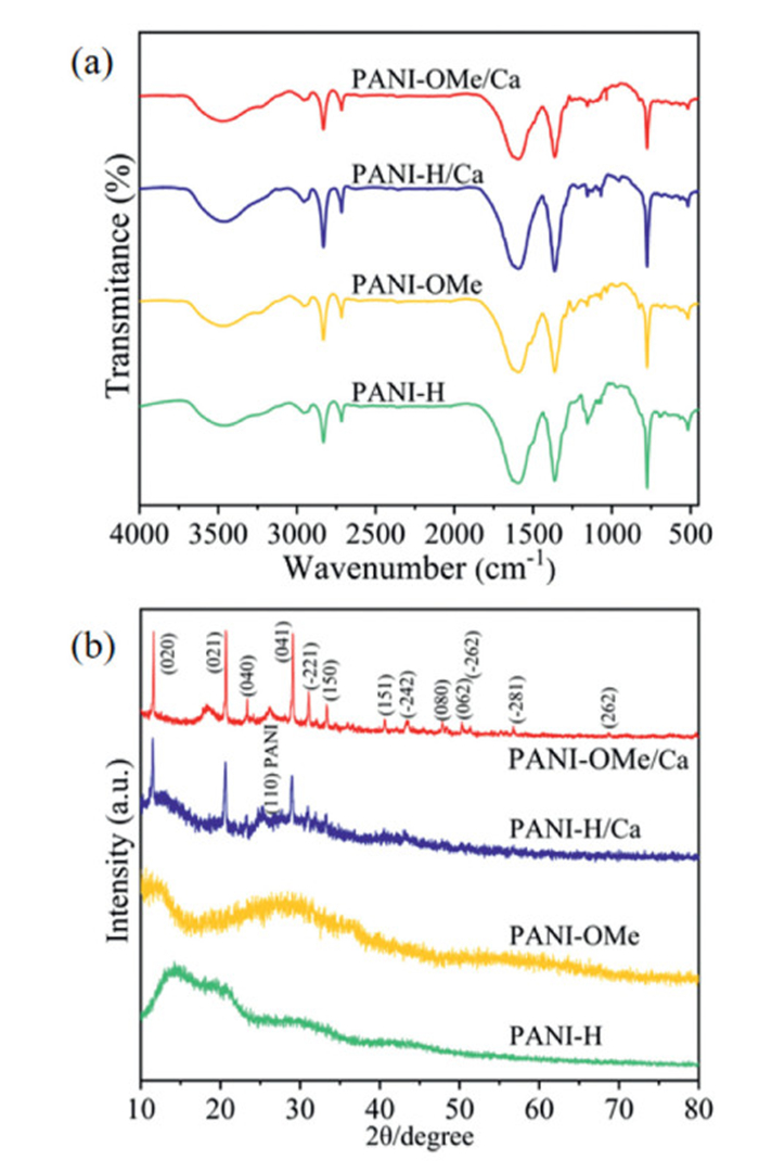 The powder X-ray diffraction (XRD) patterns of the materials show that without metal-doping, PANI-H and PANI-OMe are amorphous materials, and only typical polyaniline skeleton peaks can be observed (Fig. 2b) [27]. For PANI-H/Ca and PANI-OMe/Ca, the Ca residues exist in the form of CaSO4·2H2O, as being reflected by the typical peaks (JCPDS No. 33-0311) in XRD pattern (Fig. 2b) [28]. The narrower FWHM of Ca residue peaks in PANI-OMe/Ca indicates that they exist with better crystallinity [29]. In the XRD patterns of PANI-H/Ca and PANI-OMe/Ca, the broad peak at 2θ = 25.3° is in accordance with the signal of the facet {110} of PANI [30], showing that even the Ca-doped PANI materials are of certain crystallinity, and this is quite different to the amorphous PANI-H and PANI-OMe. The crystallinities of Ca-doped PANIs attribute to the overlaps of benzene and quinone rings in PANI chain [31].