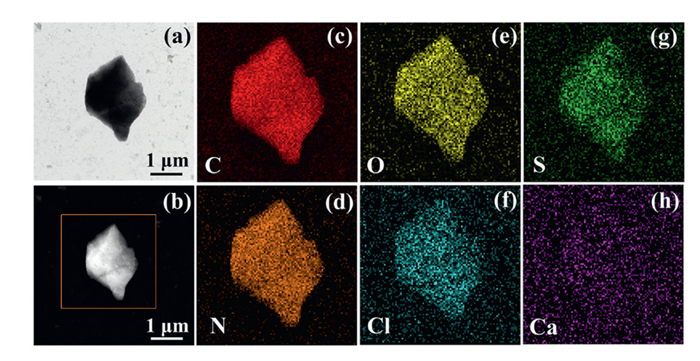 Figure 4.  Composition analysis of PANI-OMe/Ca: (a) TEM image; (b) HAADF-STEM image; and (c–h) elemental mapping images.