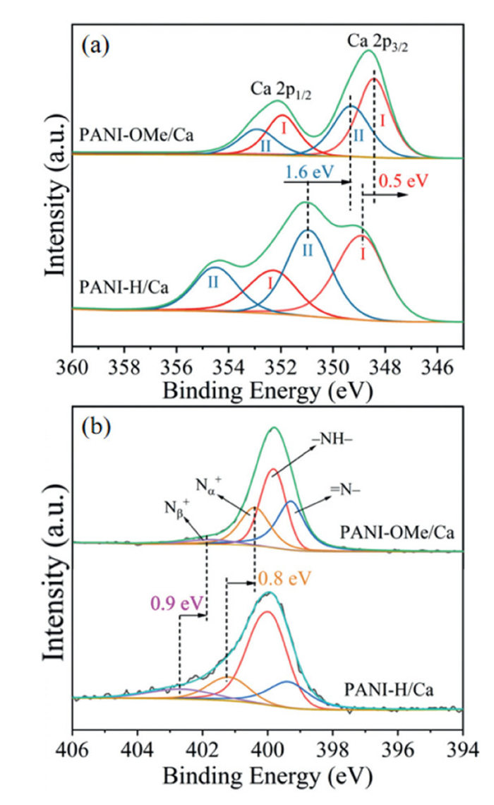 Fig. 5 shows the high-resolution X-ray photoelectron spectroscopy (XPS) of Ca 2p and N 1s in PANI-H/Ca and PANI-OMe/Ca (detail data given in Tables S1 and S2 in Supporting information). The spectrum of N 1s of PANI-H/Ca can be deconvoluted into four regions. The peak at 399.4 eV attributes to =N− [33,34]. The peak near 399.9 eV reflects −NH− [33]. The signal at 401.2 eV reflects the Nα+, which is related to the polaron and bipolar nitrogen cations [35]. The peak at 402.6 eV attributes to Nβ+, related to the protonated amine unit. Due to the strong electron localization caused by the poor conjugation on the sp3 bond, the binding energy of the protonated amine unit is high [36]. For PANI-OMe/Ca, we found that the content of Nβ+ decreased (4.2% vs. 10.0%), while the content of Nα+ elevated (24.8% vs. 15.1%), indicating the increased doping of the material [37]. There is an obvious shift for the binding energy of Nβ+, verifying that introducing the electron-donating MeO- can affect the electron density around the nitrogen groups coordinating with calcium [37]. In the spectrum of PANI-OMe/Ca, the contents of =N− and −NH− are similar, resulting in better overlaps of the quinone structure and benzene structure to enhance the material crystallinity, which is consistent with the analysis result of XRD (Fig. 2b).