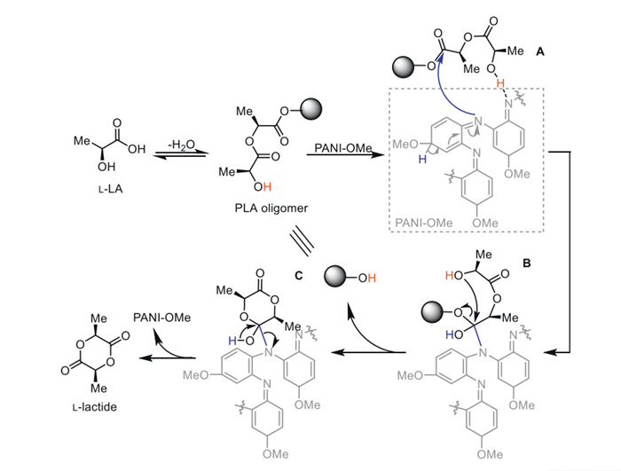 • Figure 1  PANI derivatives-catalyzed L-LA condensation to produce L-lactide: (a) The reactions catalyzed by PANI-H, PANI-OMe, PANI-H/Ca and PANI-OMe/Ca; (b) Catalyst recycling and reusing for the reactions with PANI-OMe/Ca catalyst.