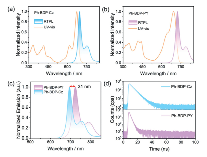 Figure 5  (a) Spectral overlap between absorption spectra of BODIPY derivatives and PL spectra of 2DPACzBP sensitizer in toluene solution, c = 1 × 10−5 mol/L. (b) Normalize emission of Ph-BDP-Cz and Ph-BDP-PY in 1% doped films. (c) The transient photoluminescence decay curves, λex = 375 nm, 20 ℃. (d) Delayed fluorescence lifetime decay curves of Ph-BDP-Cz and Ph-BDP-PY in 1% doped films, λex = 375 nm, 20 ℃.