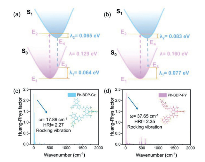 Figure 4.  Reorganization energy of (a) Ph-BDP-Cz and (b) Ph-BDP-PY between S0 and S1. (c, d) The calculated Huang–Rhys factor of Ph-BDP-Cz and Ph-BDP-PY (inset: selected vibration modes with the most significant contribution to the Huang–Rhys factor).