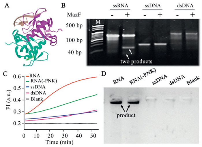 Figure 2  Cleavage of ssRNA with MazF and in vitro specific RNA cleavage-initiated amplification. (A) Model of MazF-ssDNA analogue complex structure (PDB ID: 5CR2). (B) Electrophoretic analysis of cleavage of different substrates by MazF. Substrates and products were resolved by 15% denaturing PAGE. Arrows indicate RNA product of MazF cleavage. (C) Real-time fluorescence of RCA with different cleavage products. (D) Electrophoretic analysis of RCA products with 0.8% agarose gel. Arrows indicate RCA product.