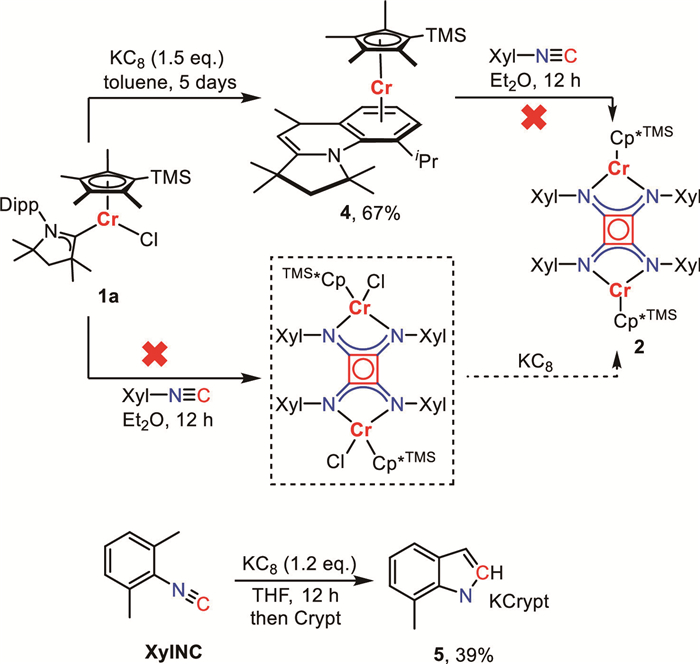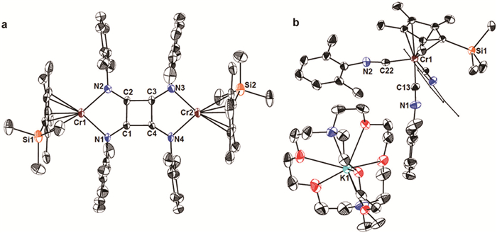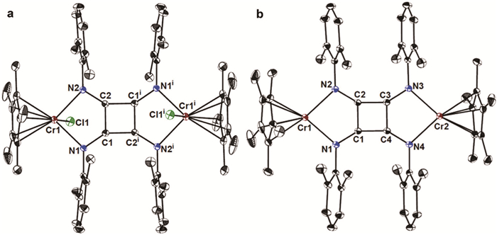 With the starting materials in our hands, we started our investigation of the cyclooligomerization of isocyanides. Treatment of KC8 with a 1:1 mixture of Cp*TMSCr(CAAC)Cl (1a) and XylNC in diethyl ether (Et2O) solution gave complex 2 in 24% yield (based on XylNC) (Scheme 3). Dark crystals of 2 suitable for X-ray diffraction studies were obtained from n-hexane at −35 ℃. The structure of 2 (Fig. 1a) features a symmetrical geometry encompassing a planar four-membered carbocycle. The absence of CAAC ligands in the final products suggests their likely dissociation during the reaction process. Direct application of [Cp*TMSCr(μ-Cl)]2 in the reaction system failed to yield the desired compound 2, highlighting the necessity for a supporting ligand to facilitate this transformation. In addition, alkyl isocyanides (CyNC or tBuNC) were also tested under the same reaction conditions. During the process, a distinct color transition of the reaction mixture from purple to dark red was observed. However, despite repeated attempts, the corresponding crystalline products could not be isolated.