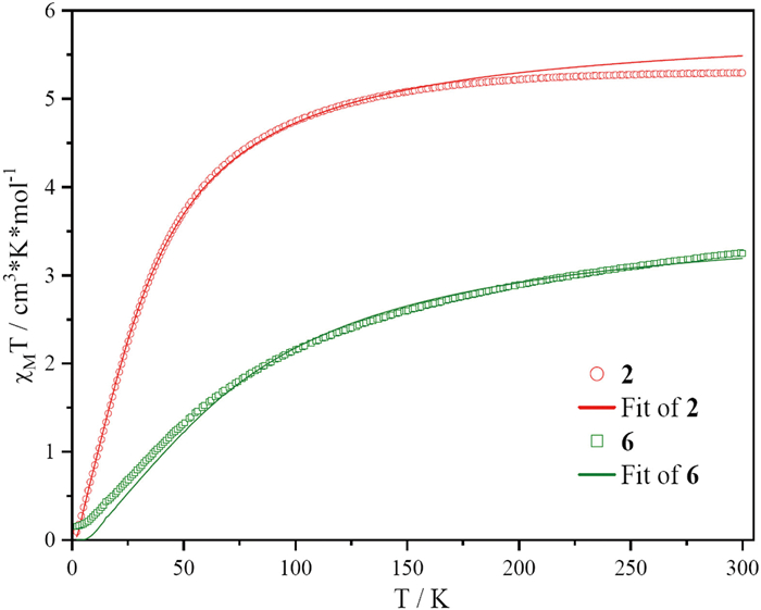 Figure 7  Temperature dependence of the magnetic susceptibility under an external magnetic field of 1000 Oe and simulations with the domain model (solid lines) for complexes 2 and 6.