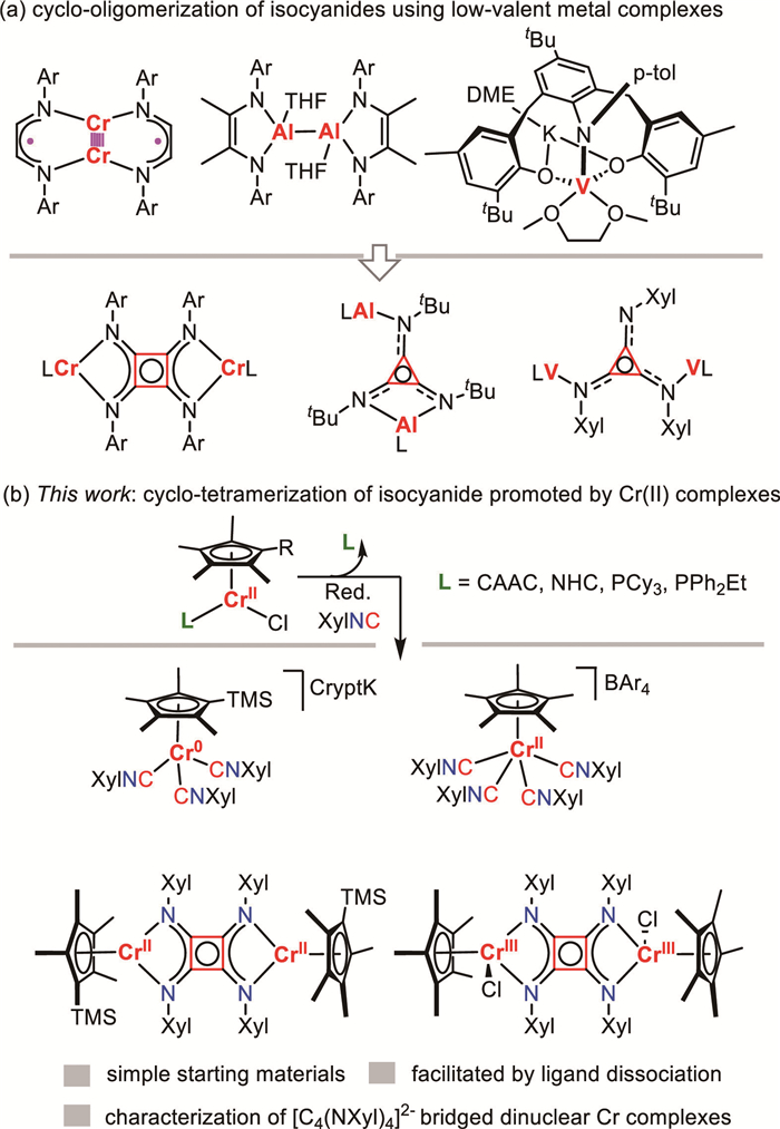 • The precise oligomerization of simple molecules to yield elaborate organic compounds is a fascinating theme in organometallic chemistry, as it allows for the rapid and atom-economical construction of complex molecular structures [1]. Isocyanide, an isoelectronic analogue of carbon monoxide (CO), is widely utilized as a C1 building block. Due to the variability of the N-substituent, isocyanide has the intrinsic advantage of adjustable spatial and electronic effects, making it widely used in organometallic chemistry and organic synthesis [2,3]. Compared to the rapid development of polymerization reactions of isocyanides [47], the trimerization, tetramerization, and pentamerization, of isocyanides have been developed in recent years [822]. Among these reactions, the most challenging and attractive one may be the controllable cyclooligomerization of isocyanides. In 2014, the Theopold group first reported the cyclization coupling reaction of isocyanide, which achieved tetramerization and hexamerization of isocyanide through the quintuply bonded α-diimine chromium dimer [17]. The Jemmis group conducted in-depth research on the mechanism of the reaction using density function theory (DFT), indicating the existence of multiple spin states in this reaction [23,24]. The Yang and Kawaguchi groups used Al–Al-bonded compound and vanadium(Ⅱ) complex to achieve the trimerization reaction of isocyanide, respectively (Scheme 1a) [11,12]. Similarly, the Ellis group obtained two tetramerization products of isocyanide by reacting bis(mesitylene)niobium(0) with 6 or 7 equiv. of 2,6-dimethylphenyl isocyanide (CNXyl) [18]. The Chu group reports an elegant step-by-step coupling reaction between a neutral Al(Ⅰ) complex (MeNacNac)Al, MeNacNac = HC[(CMe)(NDipp)]2, Dipp = 2,6-diisopropylphenyl) and various isocyanides [19]. Despite that several achievements have been made, there remain challenging issues to be addressed: (1) Specialized low-valent metal complexes are required as feedstock; (2) The reaction mechanism is not yet fully understood; (3) The electronic structures of the polymeric products are unclear. Therefore, research on cyclooligomerization of isocyanides still has a long way to go.