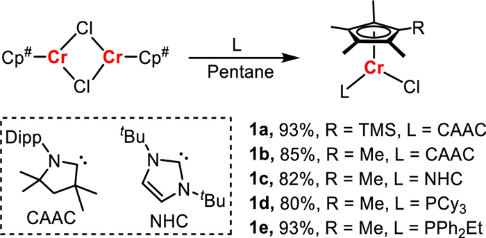The precursors 1a-1e were obtained by the reaction of [Cp#Cr(μ-Cl)]2 (Cp# = Cp* or Cp*TMS) with either carbene (CAAC and NHC) or phosphine ligands (PCy3 and PPh2Et) in pentane (Scheme 2), following a method previously established by our group [32,33]. By single-crystal X-ray structural analysis (for details, please see Supporting information), it can be seen that these compounds have similar geometric structures. The solution magnetic susceptibility measurement shows that different ligands have a significant impact on the electronic structure of chromium chloride. The chromium chlorides coordinated with carbene ligands displayed high-spin characteristics (μeff (1a) = 4.7 μB, μeff (1b) = 4.5 μB, μeff (1c) = 4.5 μB). In contrast, chromium chlorides 1d and 1e with phosphine ligands exhibit much lower μeff values under identical experimental conditions, with solution magnetic moments μeff of 2.8 μB and 2.6 μB, respectively (Evans method). This result appears counterintuitive. To better understand these findings, we calculated different spin states of these complexes. Our calculations indicate that Cp*CrLCl complexes, regardless of ligand type, are predicted to have a quintet ground state due to the unsaturated coordination of the Cr centers. However, we currently do not have a comprehensive explanation for the observed μeff values from Evans method. It is worth noting that we found that similar results have been observed in the literature: carbene-coordinated chromium chlorides exhibited higher μeff values [32,34], while phosphine-coordinated chromium chlorides exhibited lower μeff values [33,35,36].
