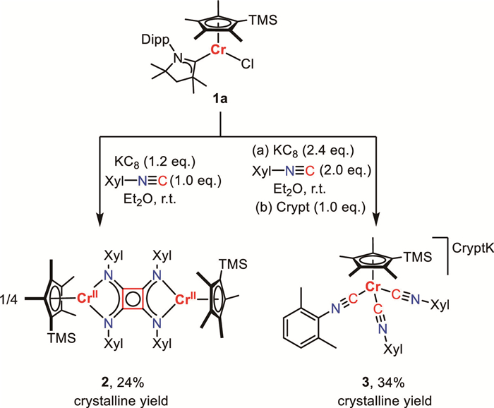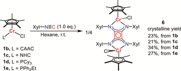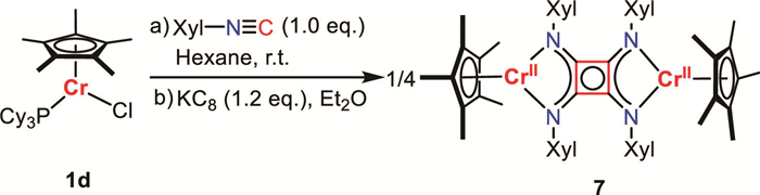 Our group has been dedicated to the activation and transformation of small molecules [2531]. Recently, we utilized a cyclopentadienyl chromium system to activate and derivatize dinitrogen gas (N2) [25]. In these studies, we found that low-valent Cr(Ⅰ) centers stabilized by cyclopentadienyl ligands can be generated during the reaction, further reacting with N2. In addition, our study found that in reactions utilizing cyclopentadienyl chromium complexes coordinated with specific monodentate ligands, these monodentate ligands undergo dissociation. Therefore, we believe that by adding a reducing agent, suitable cyclopentadienyl chromium complexes can form low-valent Cr centers in the reaction, which further react with isocyanides to promote the reductive coupling of isocyanide. Herein, we report the cyclooligomerization of isocyanides by a simple chromium(Ⅱ) complex, resulting in [C4(NXyl)4]2− bridged dinuclear chromium(Ⅱ) or chromium(Ⅲ) complex (Scheme 1b).