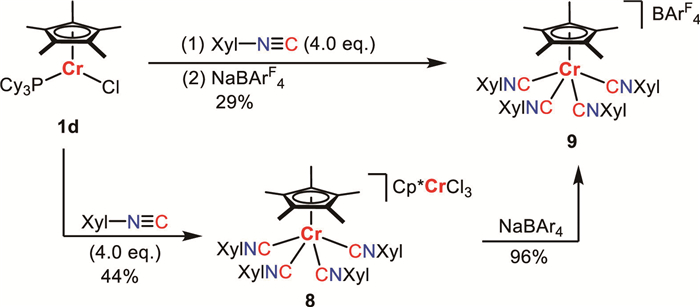 In our system, 1a reacts with 2 equiv. of isocyanide to obtain 3. For comparison, when Theopold's quintuply bonded chromium dimer reacts with excess isocyanides, tetramers and hexamers of isocyanides are formed. Expanding our exploration, we also treated 1d with XylNC in a 1:4 molar ratio in diethyl ether at room temperature, affording 8 in 44% isolated yield (Scheme 7). The molecular structure of 8 is shown in Fig. 5. In the structure of 8, it is unclear whether Cp*Cr(CNXyl)4 and Cp*CrCl3 are two crystallographically independent molecules in the unit cell or a cation/anion pair. To clarify this, we attempted an anion exchange reaction by reacting 8 with NaBArF4. This reaction produced 9 with a high yield of 96%, confirming that chromium is divalent in [Cp*Cr(CNXyl)4]+. The crystal structure of the cationic unit in 9 is similar to that in 8. When NaBAr4F is directly added to the mixture after the reaction between 1d and XylNC, 9 can also be obtained smoothly. 9 is diamagnetic, as evidenced by its 1H NMR spectrum, which shows all signals within the range of 0 to 10 ppm (Fig. S33 in Supporting information). It is worth noting that the presence of [Cp*CrCl3] in 8 indicates that some starting materials may act as reducing agents. In fact, we also observed the formation of a monovalent chromium compound (S2) in this reaction (Fig. S17 in Supporting information), indicating that the tetramerization is accompanied by an oxidation–reduction side reaction. Furthermore, these results highlight that the reaction between 1 and isocyanide exhibits significant sensitivity to the stoichiometric ratio of isocyanide, with an excess of isocyanide driving the reaction pathway toward forming isocyanide-chromium coordination complexes.