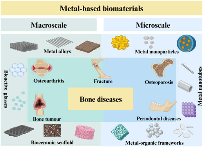 Figure 1.  Classification diagram of metal-based biomaterials utilized for common bone-related diseases. The macroscale classification comprises metal alloys, Bioactive glasses, and bioceramic scaffolds. The microscale classification includes metal nanoparticles, metal nanotubes, and metal-organic frameworks.