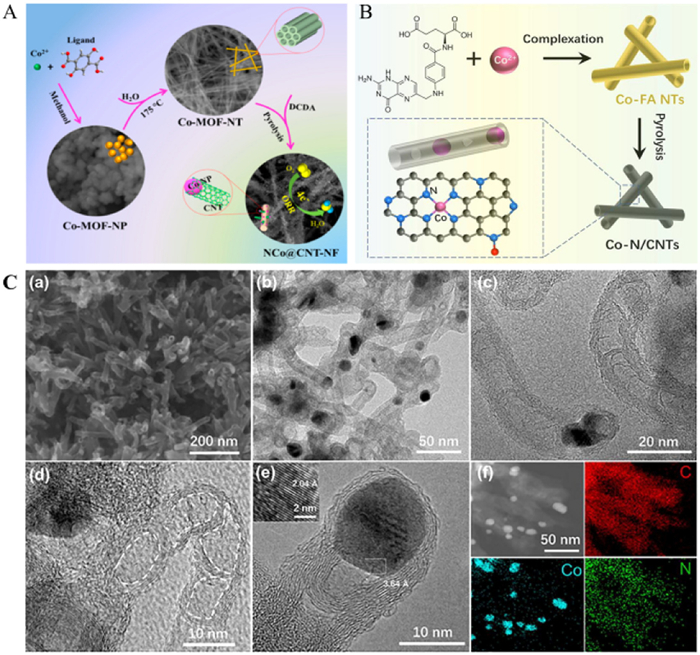 Figure 4.  (A) Schematic diagram of synthesis of single-crystal Co-MOF nanotubes. Reproduced with permission [144]. Copyright 2018, American Chemical Society. (B) Schematic illustration for the synthesis and structure of Co2+ doped single crystal MOF nanotubes. (C) The morphology and elemental mapping characteristics of Co-N/CNTs are presented: (a, b) SEM images depict the surface structure. (c–e) HRTEM images provide detailed insights into the internal features. (f) EDS elemental images illustrate the elemental distribution within the Co-N/CNTs. The illustration in (e) highlights the high-resolution lattice structure of CoNPs. Reproduced with permission [143]. Copyright 2021, Elsevier.