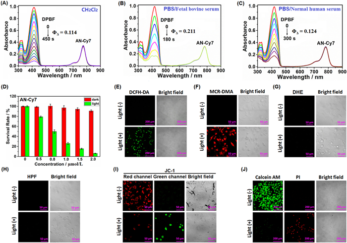 Figure 1  (A–C) Absorption spectral changes of DPBF in the presence of AN—Cy7 in CH2Cl2 and PBS supplemented with 10% FBS or normal human serum under 750 nm laser irradiation (30 mW/cm2). (D) Dose-dependent viability of the AN—Cy7-loaded A549 cells with and without 750 nm laser irradiation (30 mW/cm2, 30 min). Data are presented as mean ± standard deviation (SD) (n = 4). (E) Confocal images of the AN—Cy7 (1.0 µmol/L)/DCFH-DA (10.0 µmol/L)-loaded A549 cells treated without and with 750 nm photoirradiation. For DCFH-DA, emission was collected in 500–750 nm (λex = 488 nm). Scale bar: 200 µm. (F) Confocal images of the AN—Cy7 (1.0 µmol/L)/MCR-DMA (2.0 µmol/L)-loaded A549 cells treated without and with 750 nm photoirradiation. For MCR-DMA, emission was collected at 640–750 nm (λex = 633 nm). Scale bar: 50 µm. (G) Confocal images of the AN—Cy7 (1.0 µmol/L)/DHE (10.0 µmol/L)-loaded A549 cells treated without and with 750 nm photoirradiation. For DHE, emission was collected at 500–730 nm (λex = 488 nm). Scale bar: 50 µm. (H) Confocal images of the AN—Cy7 (1.0 µmol/L)/HPF (10.0 µmol/L)-loaded A549 cells treated without and with 750 nm photoirradiation. For HPF, emission was collected at 500–730 nm (λex = 488 nm). Scale bar: 50 µm. (I) Confocal images of the AN—Cy7 (1.0 µmol/L)/JC-1 (10.0 µmol/L)-loaded A549 cells treated without and with 750 nm photoirradiation. For green channel (JC-1 monomer), emissions were collected at 490–560 nm (λex = 488 nm); for red channel (JC-1 aggregate), at 570–750 nm (λex = 561 nm). Scale bar: 50 µm. (J) Confocal fluorescence images of the AN—Cy7 (1.0 µmol/L)-loaded A549 cells treated with 750 nm photoirradiation and then co-stained with calcein AM/PI (2.0 µmol/L /4.5 µmol/L). For calcein AM, emission collected at 505–535 nm (λex = 488 nm); for PI, at 590–700 nm (λex = 561 nm). Scale bar: 200 µm.