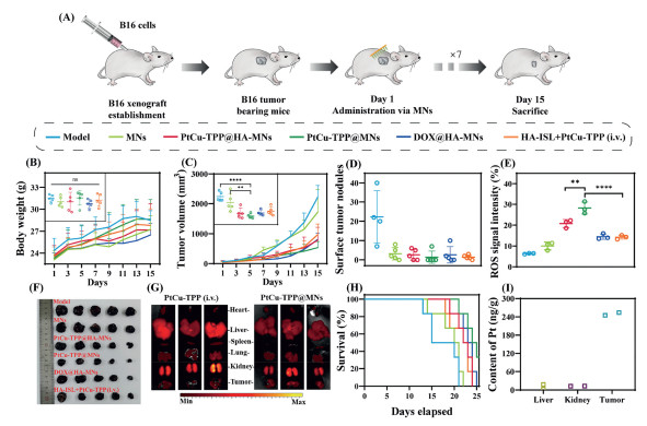 As an alternative to tail vein injection, we aimed to deliver the nanozymes by transdermal administration through MNs, which was quite suitable for the treatment of skin cancers and improved patient compliance. Toward this end, HA-ISL was first synthesized, characterized (Fig. S19 in Supporting information) and proven to suppress B16 cells proliferation and migration (Fig. S20 in Supporting information), which were probably achieved by interfering with HA-CD44 signaling [40,41]. HA-ISL was later mixed with PtCu-TPP to prepare PtCu-TPP@MNs via a micro-molding method (Fig. S21A in Supporting information, 10 × 10 array, 2.25 ± 0.096 µg/patch) [42], which were uniform and capable of penetrating mouse skin (Figs. S21B–E in Supporting information). A commercial anti-tumor drug DOX, which has proven to be effective for CM therapy [43,44], and unmodified HA were used to prepare DOX@HA-MNs as a positive control. Moreover, the rapid release of PtCu-TPP from MNs ensured swift access to tumor tissues (Fig. S21F in Supporting information).