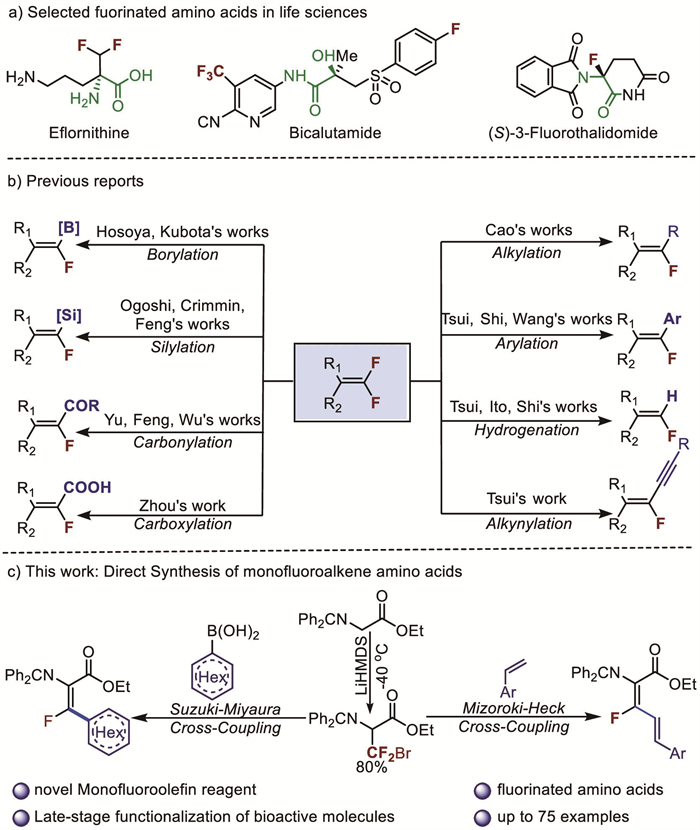• Organic fluorides have important applications in the pharmaceutical industry due to the ability of C-F bonds to alter the physical, chemical, and biological properties of small organic compounds, including solubility, metabolic stability, hydrogenbonding ability, lipophilicity, and chemical reactivity [1-4]. As a result, an increasing number of products of the pharmaceutical, agrochemical, and material science industries contain fluorine atoms as key components [5]. Nearly 20% of the top 200 drugs in 2023 contain a fluorine atom in their structure [6]. Monofluoroolefins are ideal amide-bond mimics in medicinal chemistry and hold great potential in isomer-based drug design [7], creating a growing need for efficient methods to synthesize various classes of monofluoroolefins. The alkylation [8], arylation [9-11], hydrogenation [12-14], alkynylation [15], borylation [16,17], silylation [18-20], carbonylation [21-23] and carboxylation [24] of C-F bonds in difluoroalkenes can be achieved through free radical [25-30] and metal catalysis strategies [31-48] (Fig. 1b). Although important progress has been achieved in the conversion of C-F bond to other functional groups, the application such strategy to monofluoro amino acid derivatives has not been disclosed. Here, we report a newly developed glycine containing fluoroalkylation reagent, which is directly applied to the synthesis of monofluorocarbon amino acids via a Pd-catalyzed cross-coupling reaction. A variety of arylboronic acids were well tolerated, yielding products with well-defined stereochemistry in moderate to high yields (Z:E > 20:1). Additionally, late-stage functionalization of bioactive compounds was also achieved. Furthermore, this new glycine-containing fluoroalkylation reagent was applied in Heck coupling reactions (Fig. 1c).