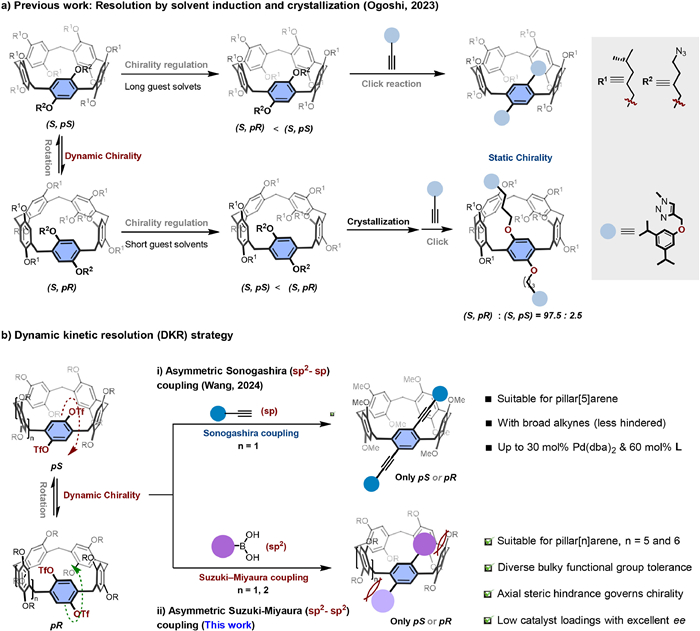 • Planar chiral macrocyclic arenes, including paracyclophanes [1,2], pillar[n]arenes [310], prism[n]arenes [11,12] and pagoda[n]arenes [13], have attracted great attention due to their unique structures and extensive applications in chiral recognition [1422], self-assembly [2325], chiral solvating agents [2629], asymmetric catalysis [30], and circularly polarized luminescence (CPL) materials [3137]. Among them, pillar[n]arenes (PAs), as potential chiral macrocyclic arenes, exhibit planar chirality due to the specific arrangement of rim substituents on their π-rings. Each repeating unit within the structure contributes to this unique chiral property, making PAs a key subject of study in the field of chiral supramolecular chemistry [3943]. In the case of pillar[5]arenes, eight stereoisomers exist, consisting of four diastereomeric pairs of enantiomers. Typically, pillar[n]arenes favor chirality-aligned conformations, like all-pS or all-pR arrangements with reduced steric hindrance. However, the interconversion between pS and pR stereoisomers readily occurs via facile flipping of the π-panel rims [3436]. This stereo-dynamic nature presents significant challenges in the asymmetric synthesis of configurationally stable macrocyclic molecules, especially in a catalytic manner.