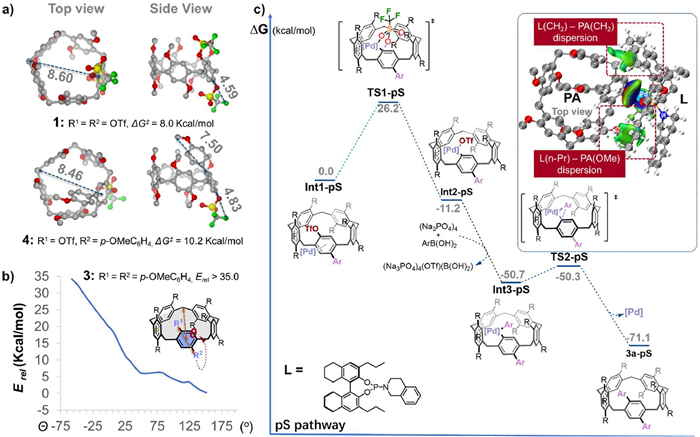 Figure 2  (a) Geometry of 1 and 4. Distances are in Å. (b) Potential energy curve along the aryl ring flipping process of 3a. (c) Gibbs free energy profile for the arylation reaction of 4 (pS pathway). Hydrogen atoms are omitted for clarity.